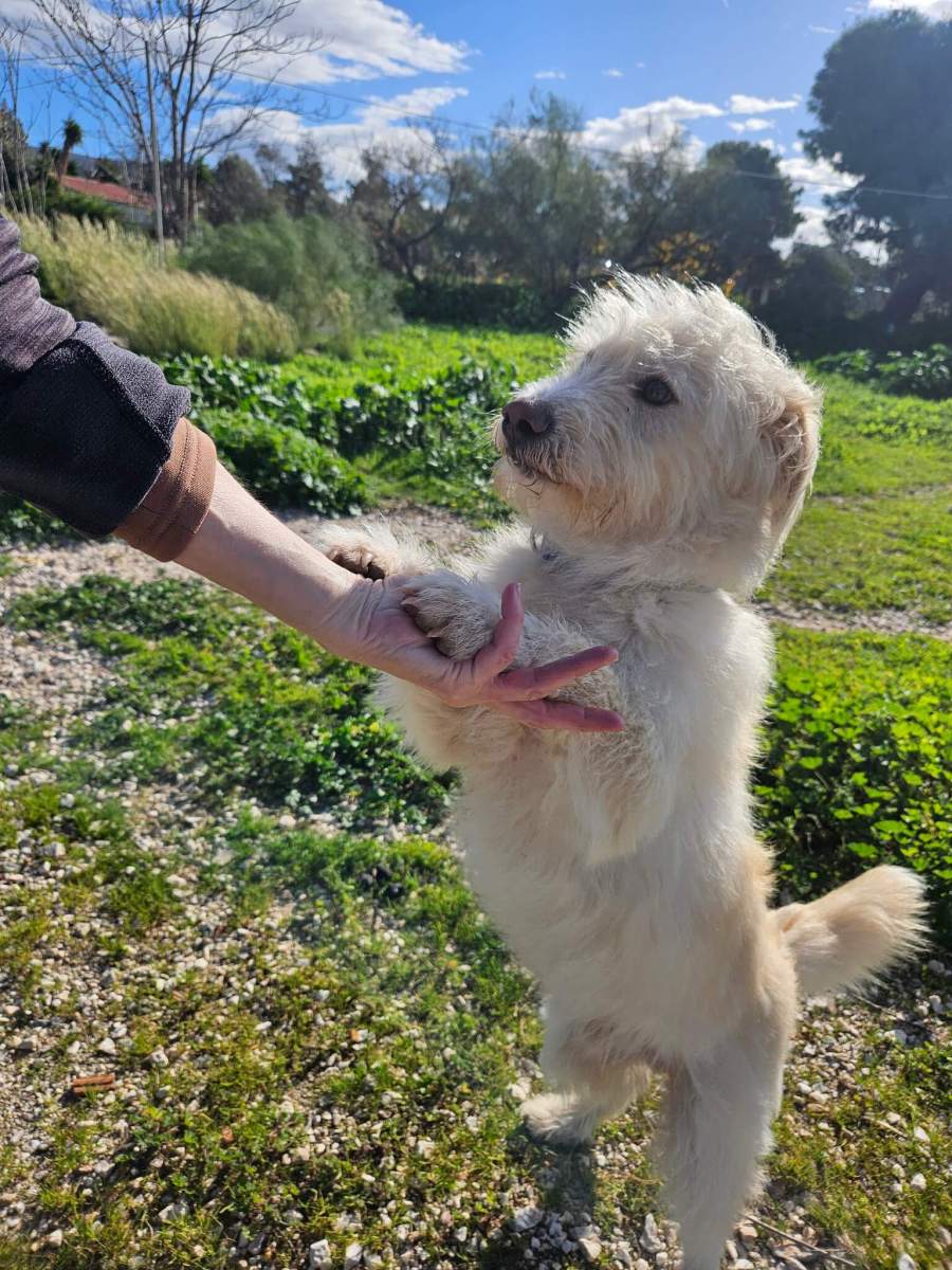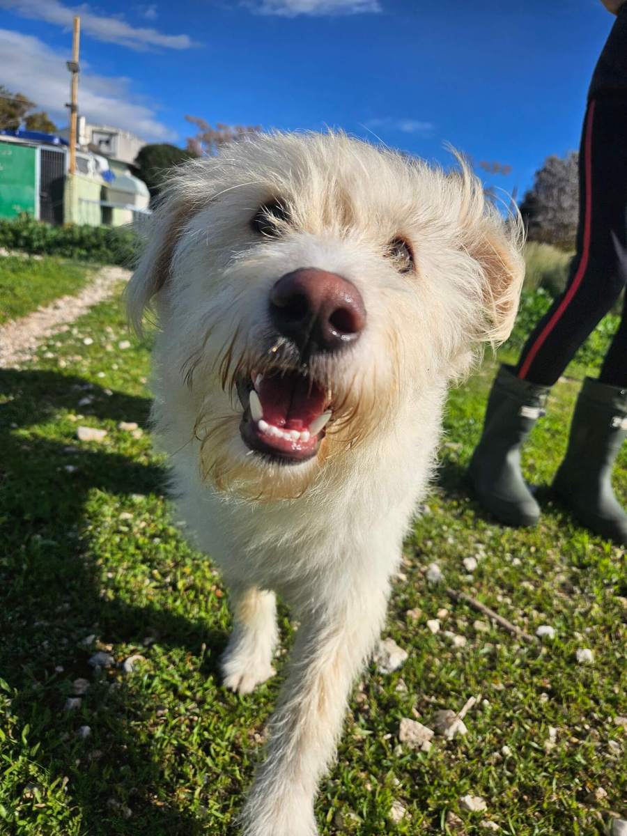 Ο Ερνέστο — ή αλλιώς ο Έρνι, όπως τον φωνάζουμε όσοι τον αγαπήσαμε από την πρώτη στιγμή — είναι ένα χαρούμενο γκριφονάκι. Από αυτά που έχεις συνηθίσει να βλέπεις σε σπίτια: να κοιμούνται ήρεμα σε μαλακά κρεβατάκια, αγκαλιά με παιδάκια, με μάτια γεμάτα εμπιστοσύνη. Και πράγματι, αυτός ακριβώς είναι ο χαρακτήρας του. Μόνο που η ζωή δεν του φέρθηκε έτσι.Βρέθηκε στην επαρχία, τραυματισμένος, φαγωμένος από αγέλες, μόνος να ζητά βοήθεια με όση δύναμη του είχε απομείνει. Ένα σκυλάκι γεννημένο κοινωνικό, χαρούμενο, να «λάμπει» — κάτι που δεν ταιριάζει καθόλου με τη σκληρή πραγματικότητα των αδέσποτων.